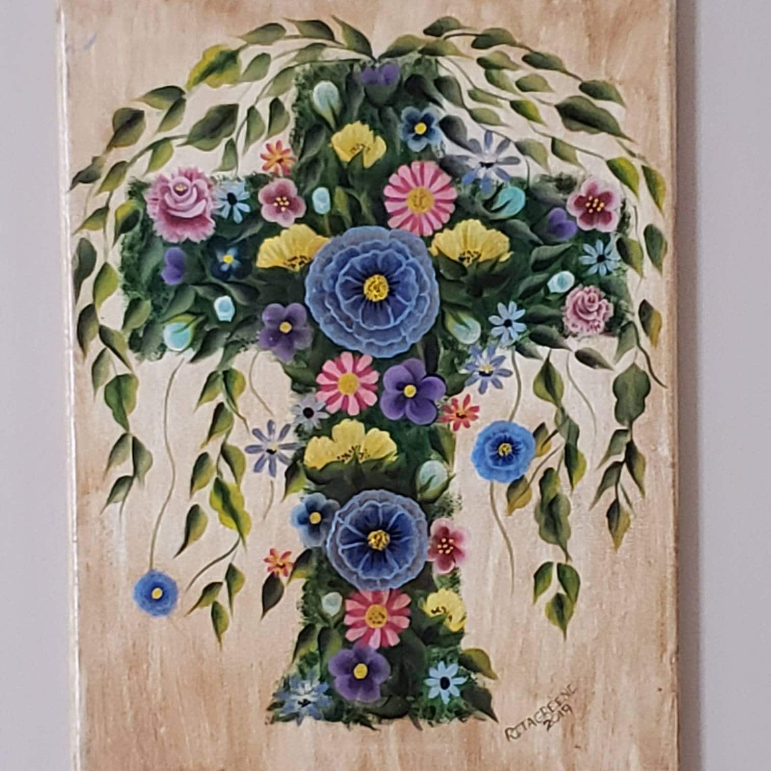 This hand painted cross is done totally freehand by myself. The inspiration came to me during these uncertain times trying to cope with the pandemic around us. Spring is here and the flowers and trees are still blooming. Keep the faith and we will pull through.